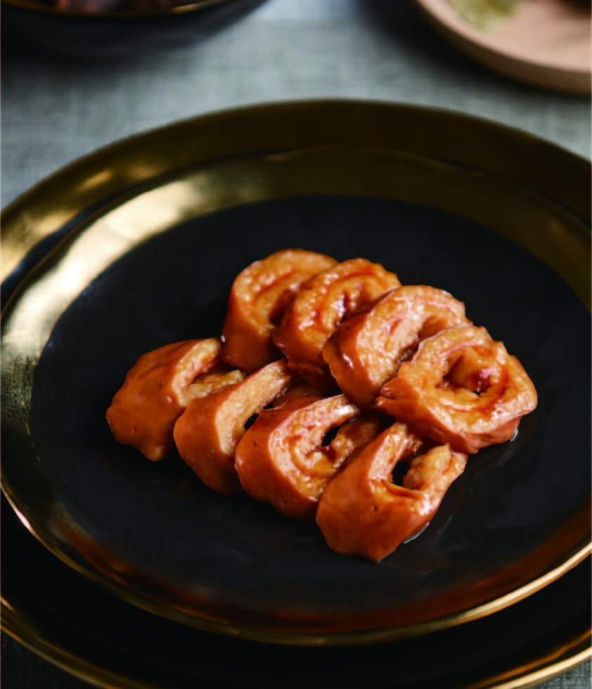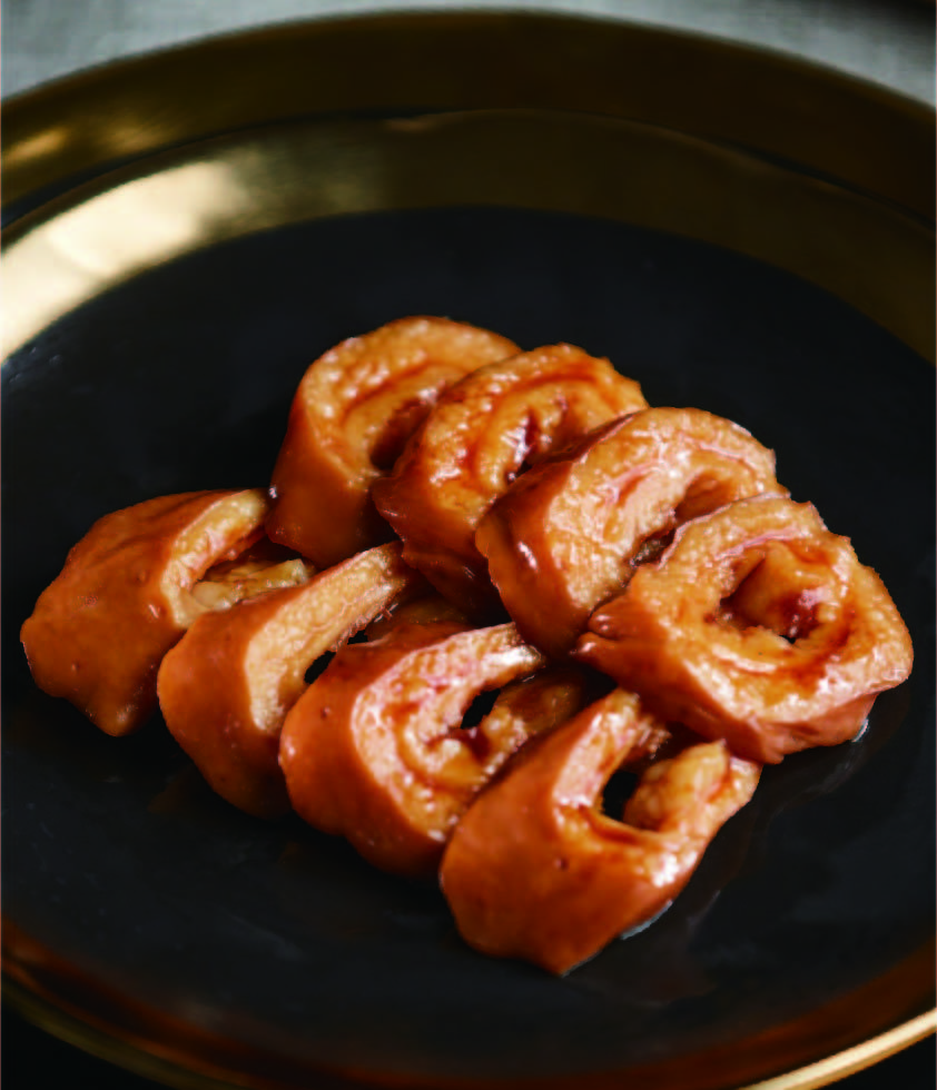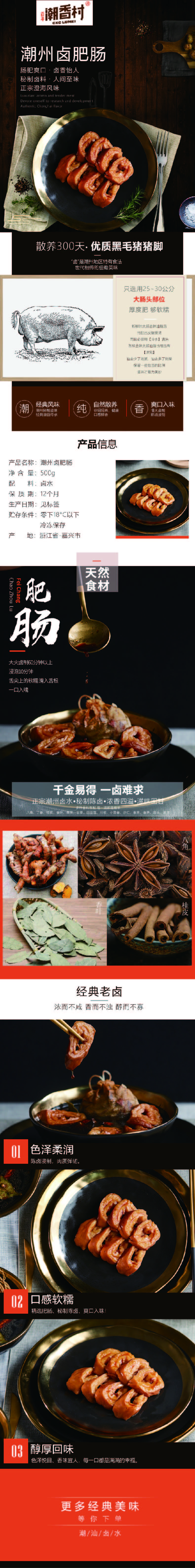 產(chǎn)品介紹:潮州鹵肥腸——九轉(zhuǎn)十八彎中的人間至味。潮香村只選用大腸頭部位置的25~30公分入料,因?yàn)樗穸确?,夠軟糯,乃肥腸爽口,鹵香味怡人!